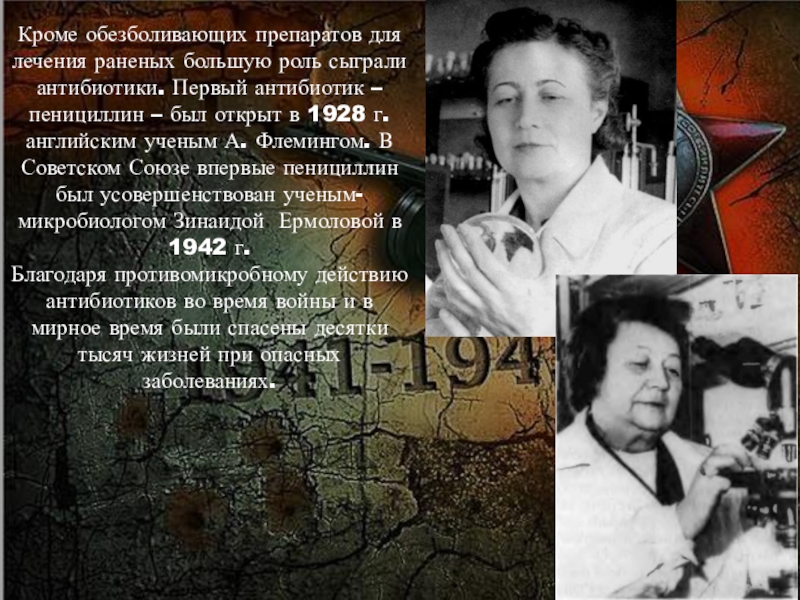 Слайд 15Кроме обезболивающих препаратов для лечения раненых большую роль сыграли антибиотики. Первый