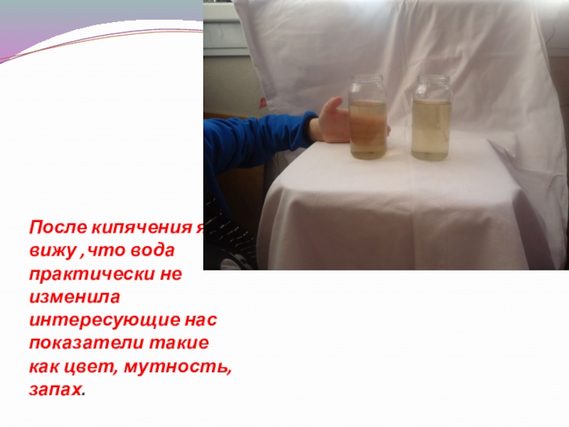 Слайд 12После кипячения я вижу ,что вода практически не изменила интересующие нас