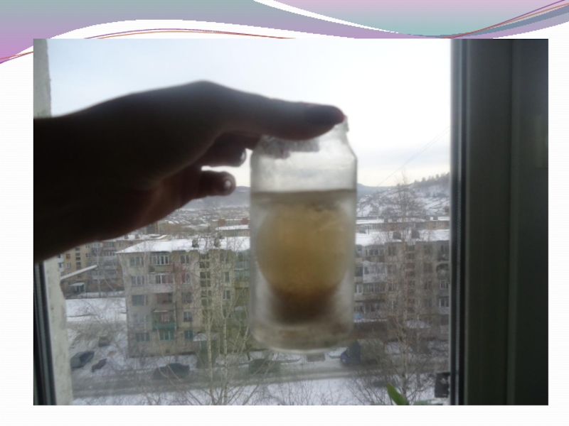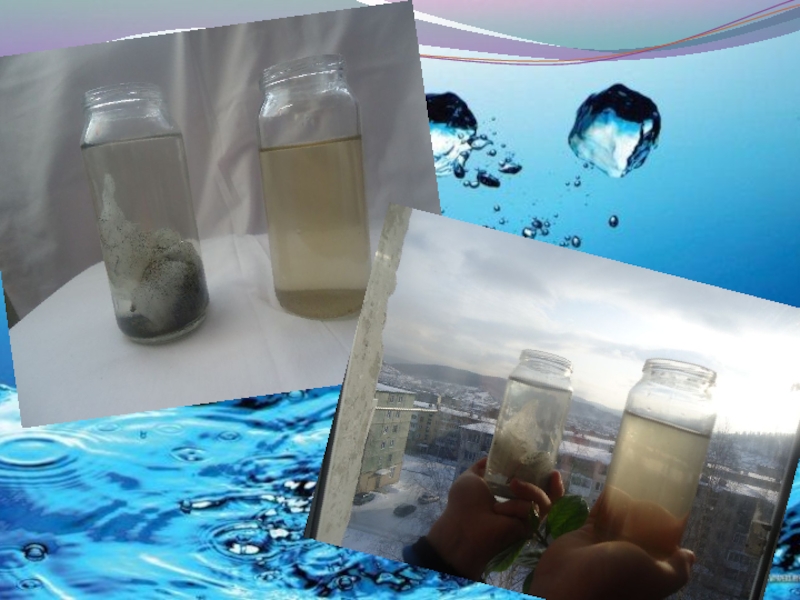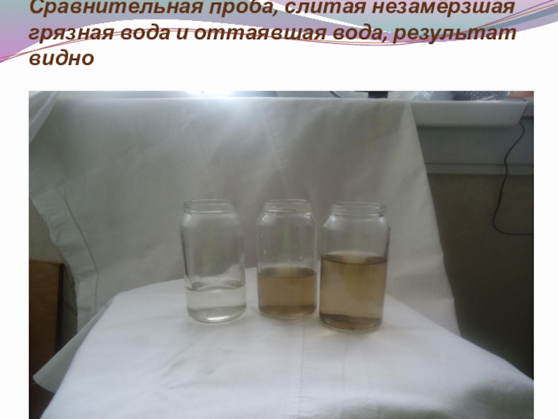 Слайд 17Сравнительная проба, слитая незамёрзшая грязная вода и оттаявшая вода, результат видно