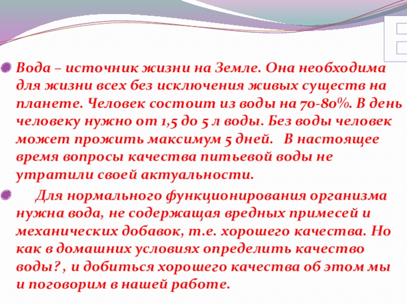 источник жизни на Земле. Она необходима для жизни всех без исключения живых существ на планете. Человек состоит из воды на 70-80%. В день человеку нужно от 1,5 до 5 л воды. Без воды человек может прожить максимум 5 дней. В настоящее время вопросы качества питьевой воды не утратили своей актуальности.
