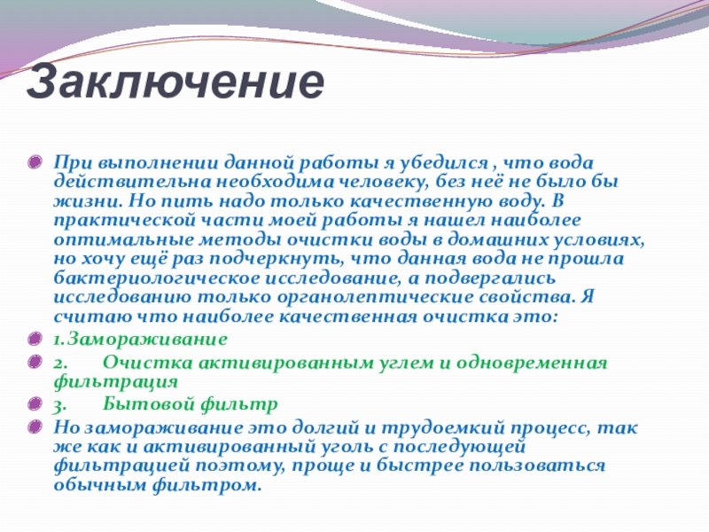 человеку, без неё не было бы жизни. Но пить надо только качественную воду. В практической части моей работы я нашел наиболее оптимальные методы очистки воды в домашних условиях, но хочу ещё раз подчеркнуть, что данная вода не прошла бактериологическое исследование, а подвергались исследованию только органолептические свойства. Я считаю что наиболее качественная очистка это: