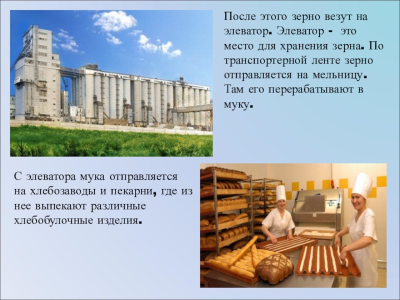 С элеватора мука отправляется на хлебозаводы и пекарни, где из нее выпекают различные хлебобулочные изделия.