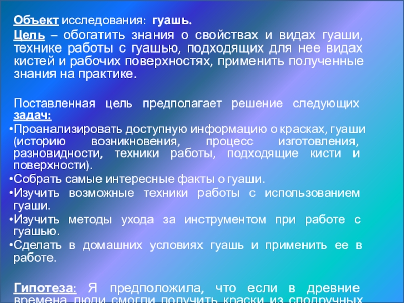 – обогатить знания о свойствах и видах гуаши, технике работы с гуашью, подходящих для нее видах кистей и рабочих поверхностях, применить полученные знания на практике.