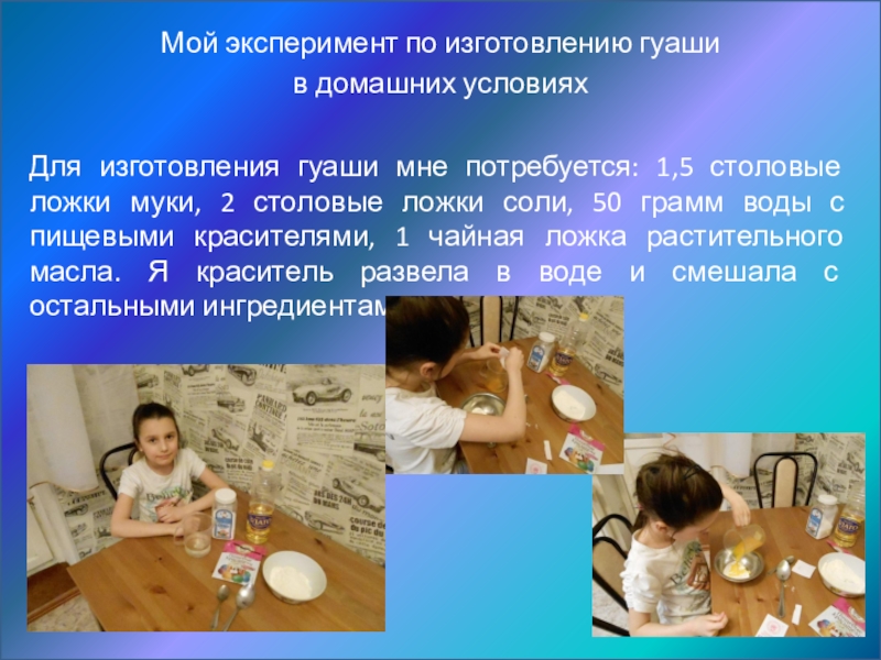 Сделать в домашних условиях гуашь и применить ее в работе.