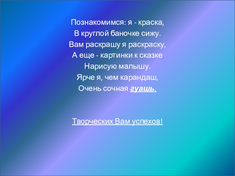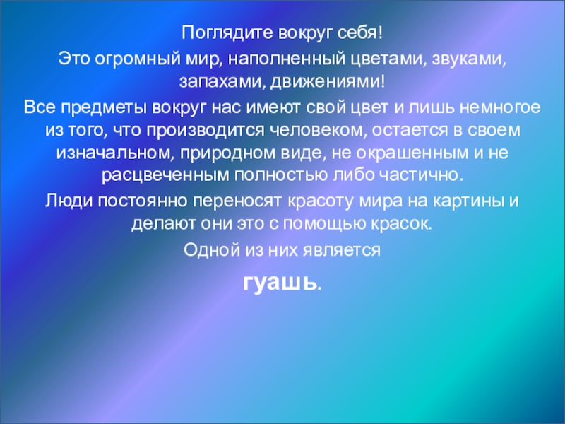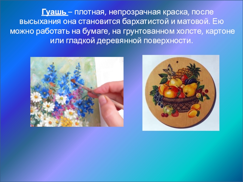 Гуашь – плотная, непрозрачная краска, после высыхания она становится бархатистой
