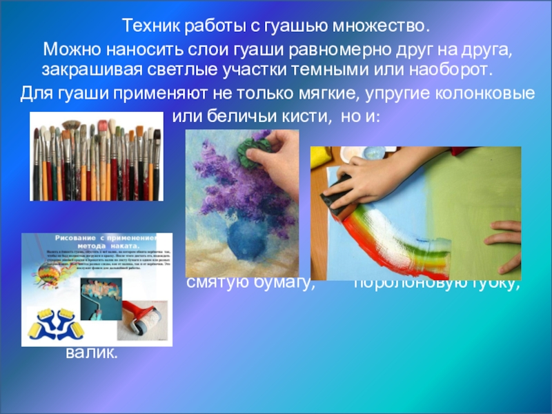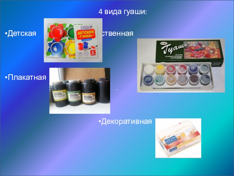 Проанализировать доступную информацию о красках, гуаши (историю возникновения, процесс изготовления, разновидности, техники работы, подходящие кисти и поверхности).