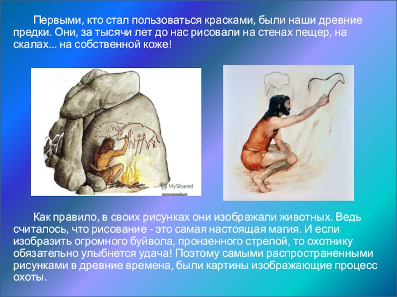 разнообразных расцветок – желтая, красная, зеленоватая и белая. Время шло и в запасе у древних художников появилась черная , синяя, коричневая, зеленая краска.