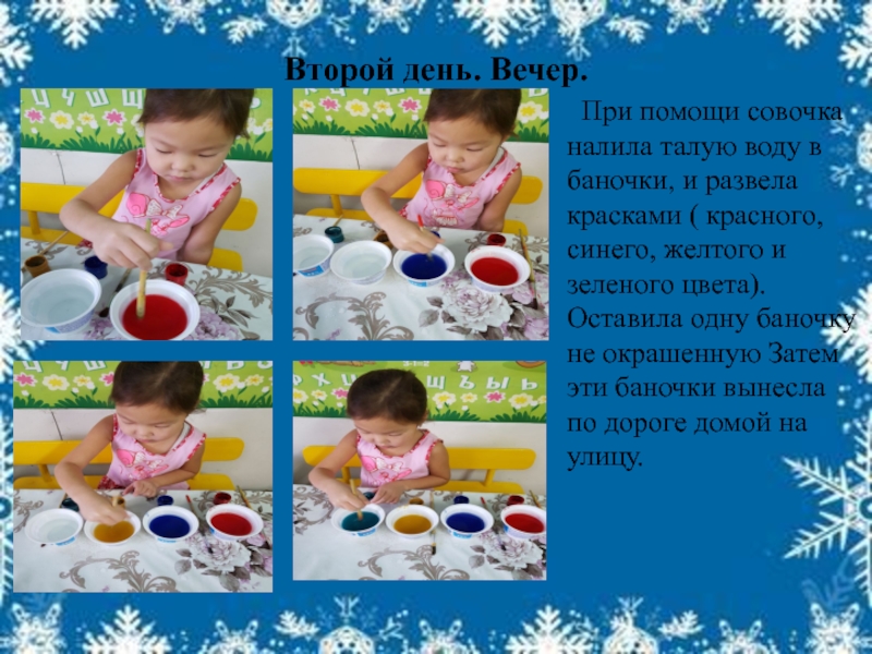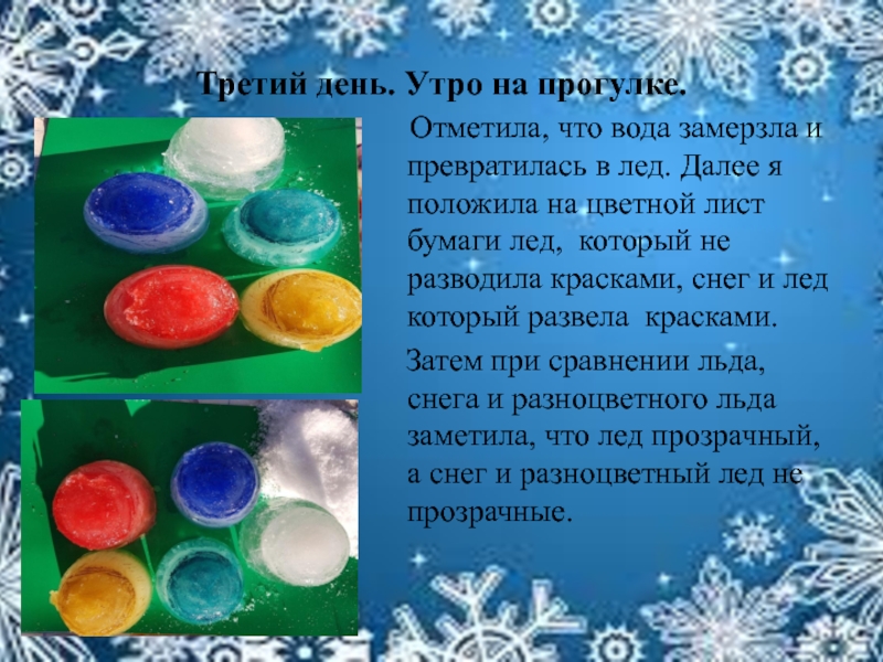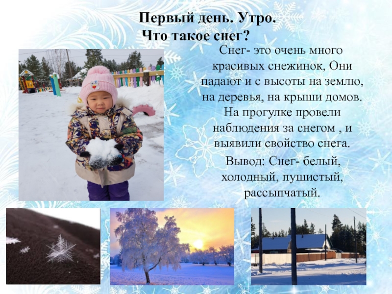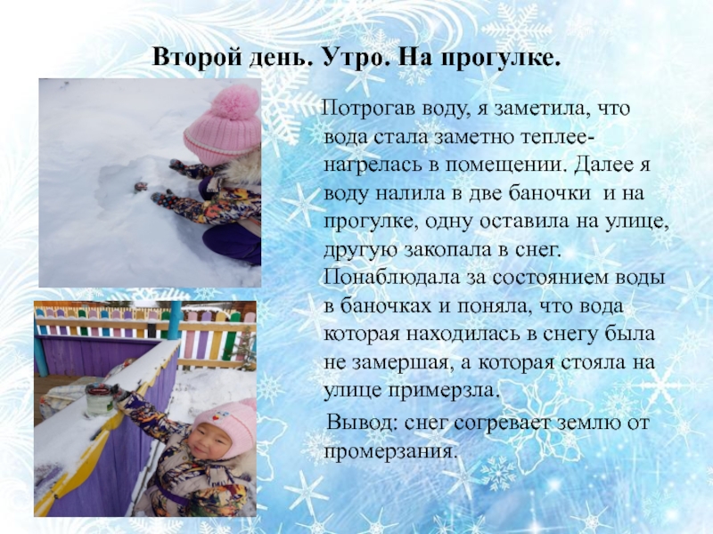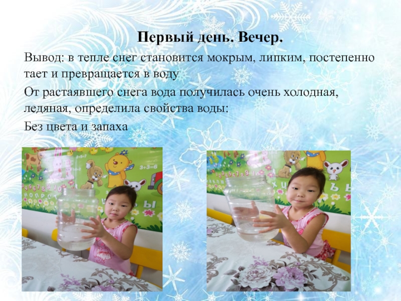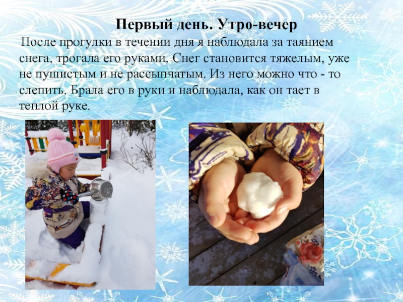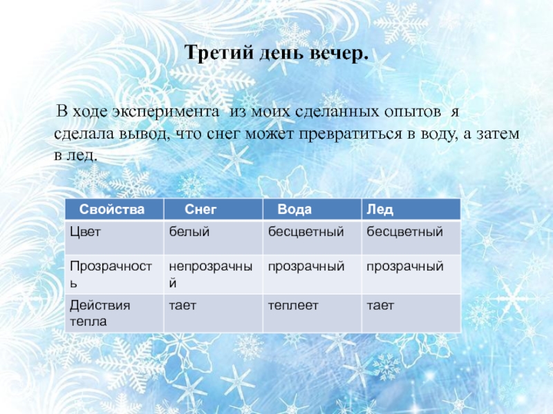 Вывод: в тепле снег становится мокрым, липким, постепенно тает и превращается в воду