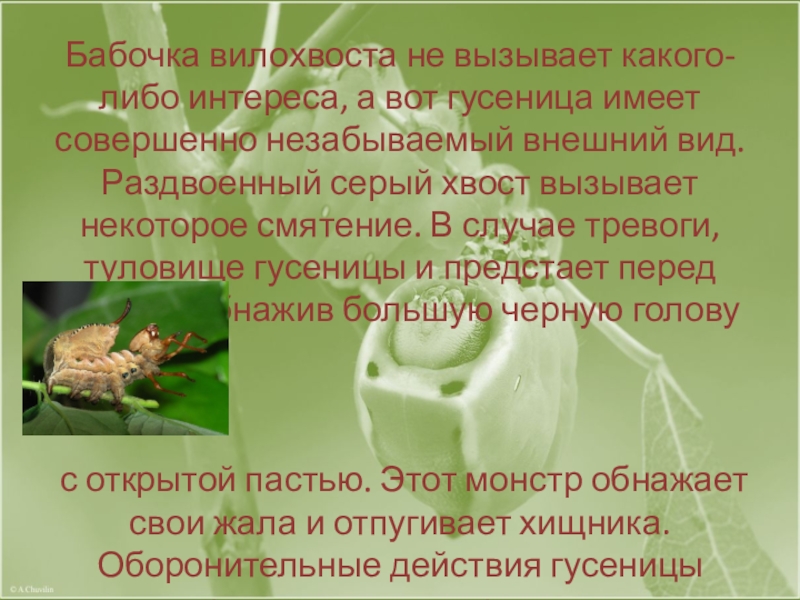 Слайд 7Бабочка вилохвоста не вызывает какого-либо интереса, а вот гусеница имеет совершенно