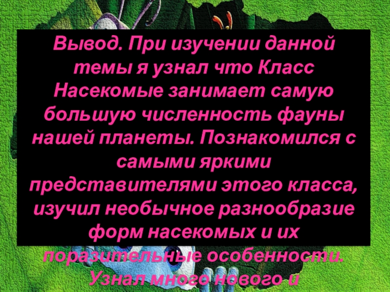 Слайд 16Вывод. При изучении данной темы я узнал что Класс Насекомые занимает