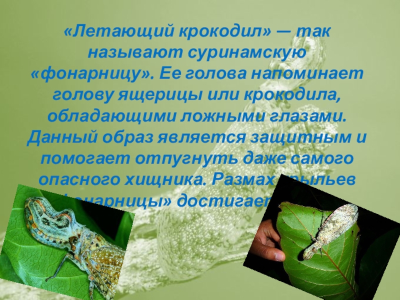 Слайд 9«Летающий крокодил» — так называют суринамскую «фонарницу». Ее голова напоминает голову