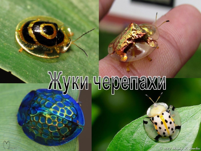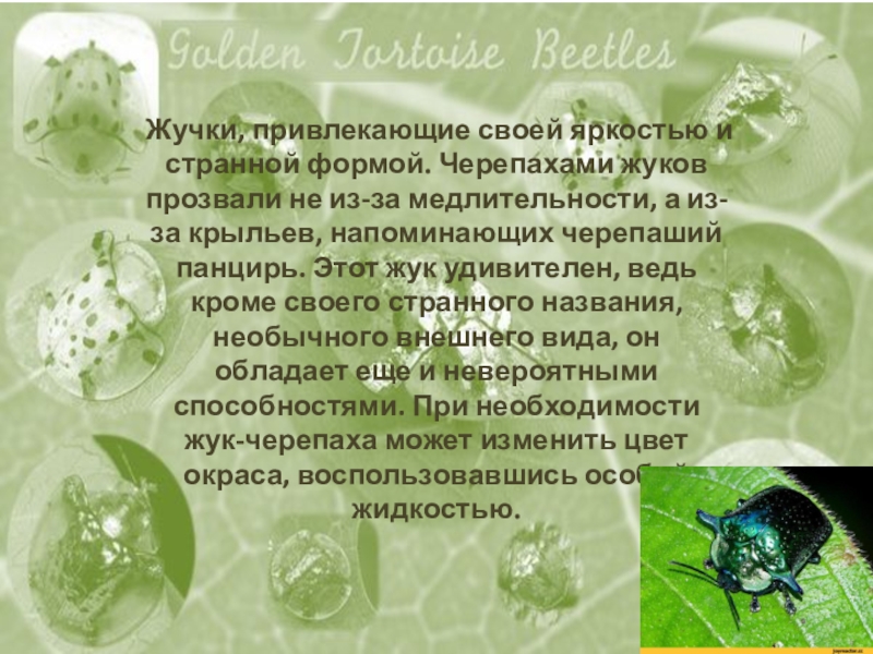 Слайд 5Жучки, привлекающие своей яркостью и странной формой. Черепахами жуков прозвали не
