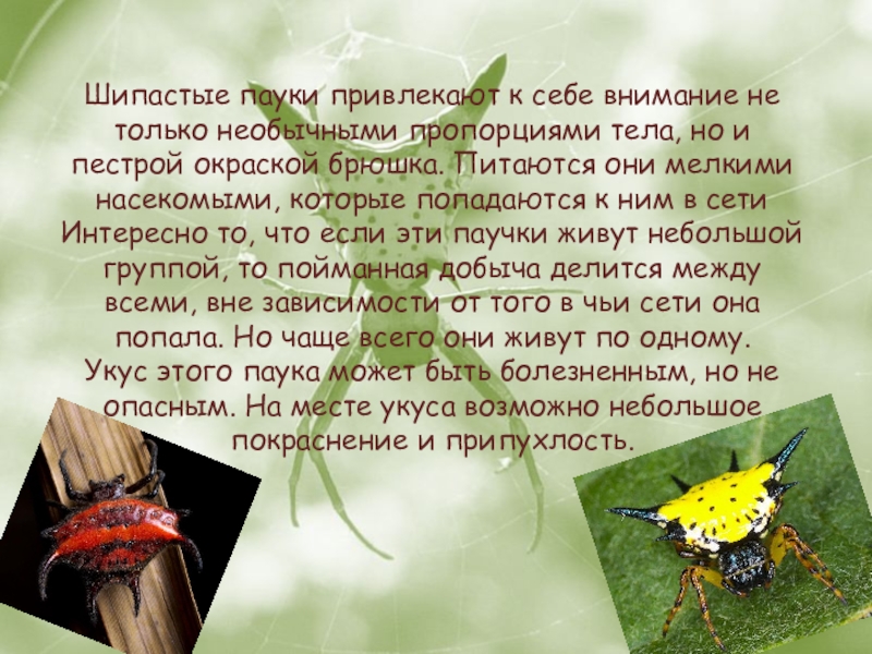 Слайд 15Шипастые пауки привлекают к себе внимание не только необычными пропорциями тела,