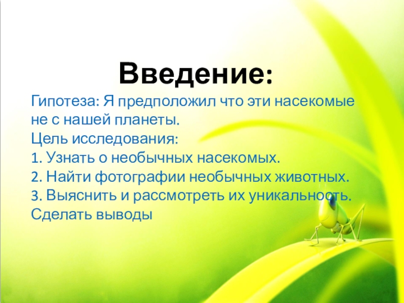 Введение:Гипотеза: Я предположил что эти насекомые не с нашей планеты.Цель исследования: 1. Узнать о необычных насекомых.2. Найти