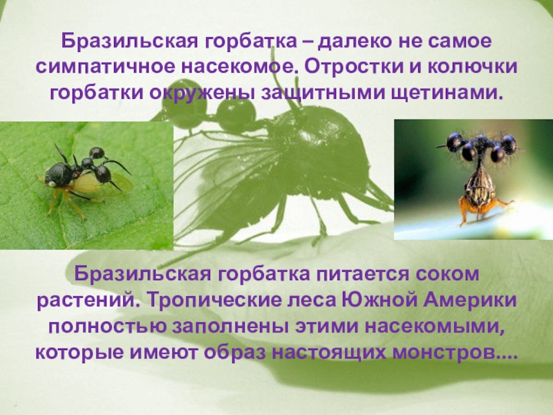 Слайд 13Бразильская горбатка – далеко не самое симпатичное насекомое. Отростки и колючки