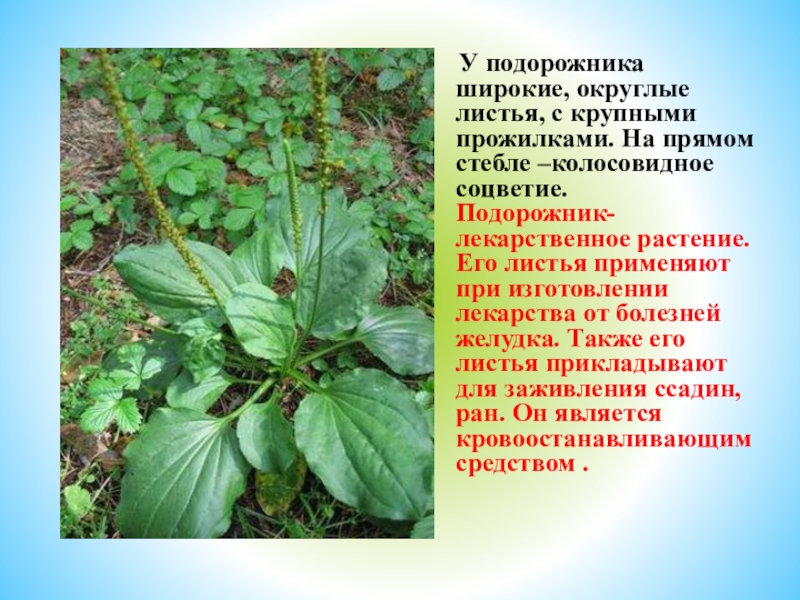 Подорожник- лекарственное растение. Его листья применяют при изготовлении лекарства от болезней желудка. Также его листья прикладывают для заживления ссадин, ран. Он является кровоостанавливающим