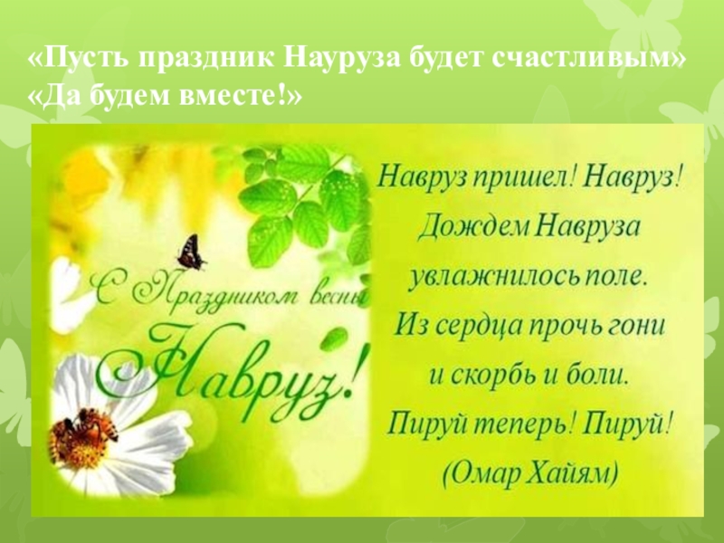 Слайд 10«Пусть праздник Науруза будет счастливым» «Да будем вместе!»