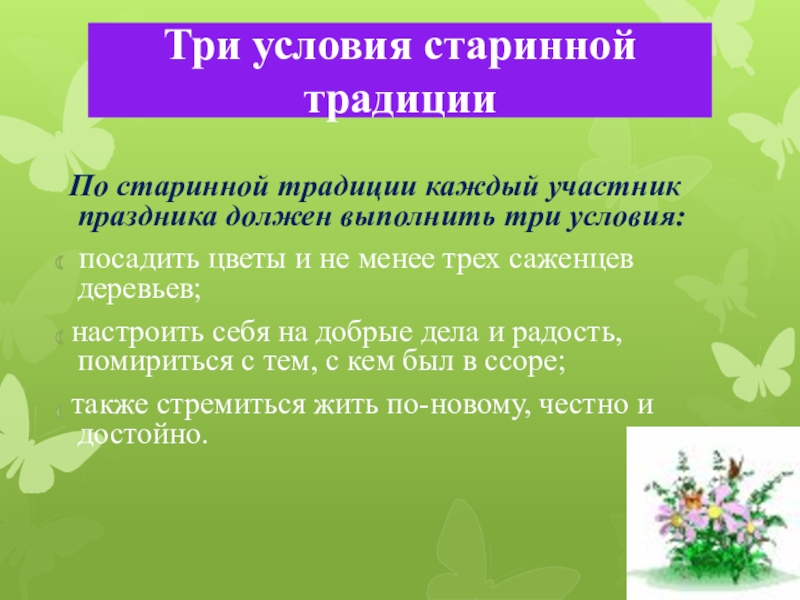 Три условия старинной традиции   По старинной традиции каждый участник праздника должен выполнить три условия: