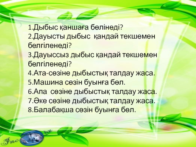 1.Дыбыс қаншаға бөлінеді? 2.Дауысты дыбыс қандай текшемен белгіленеді?3.Дауыссыз дыбыс қандай текшемен белгіленеді?4.Ата-сөзіне дыбыстық талдау жаса.5.Машина
