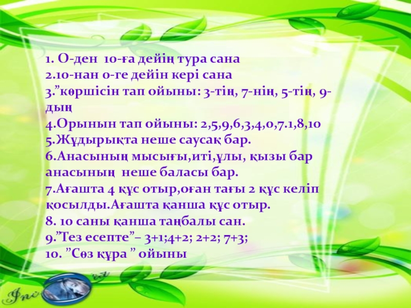 1. О-ден 10-ға дейің тура сана2.10-нан 0-ге дейін кері сана 3.”көршісін тап ойыны: 3-тің, 7-нің, 5-тің, 9-дың