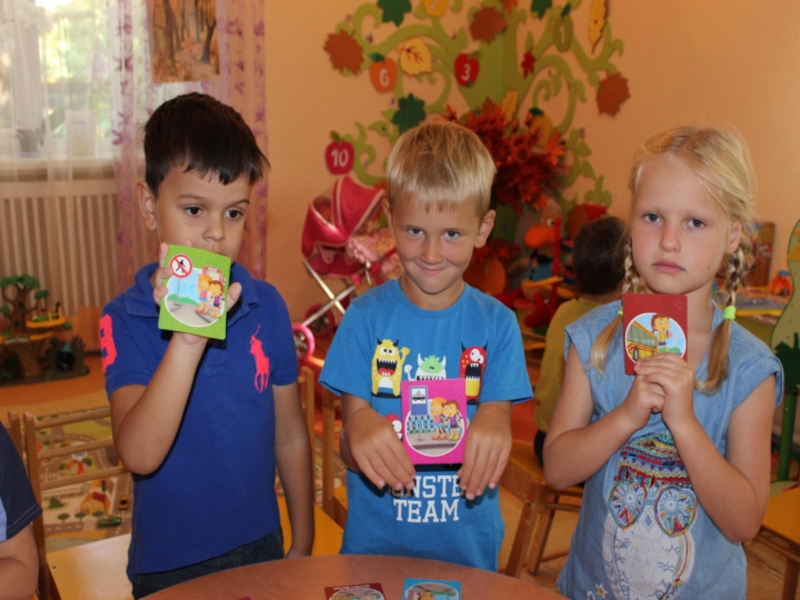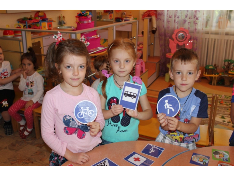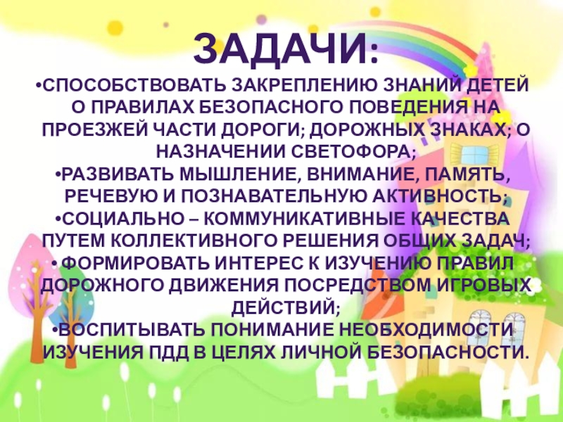 Задачи:Способствовать закреплению знаний детей о правилах безопасного поведения на проезжей части дороги; дорожных знаках; о назначении светофора;Развивать мышление, внимание, память, речевую и познавательную активность;Социально – коммуникативные качества путем коллективного решения общих задач; формировать интерес к изучению