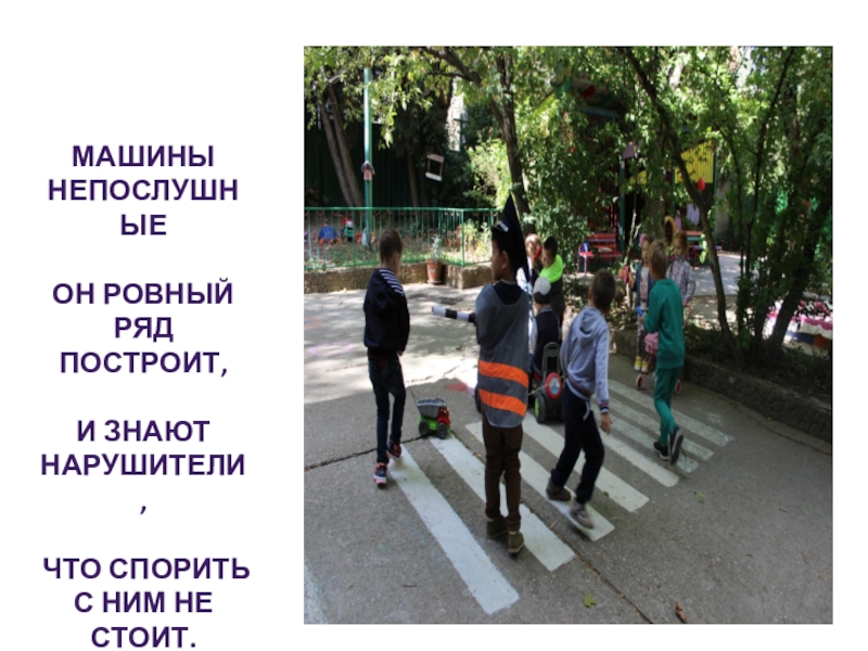 Машины непослушныеОн ровный ряд построит,И знают нарушители, Что спорить с ним не стоит.