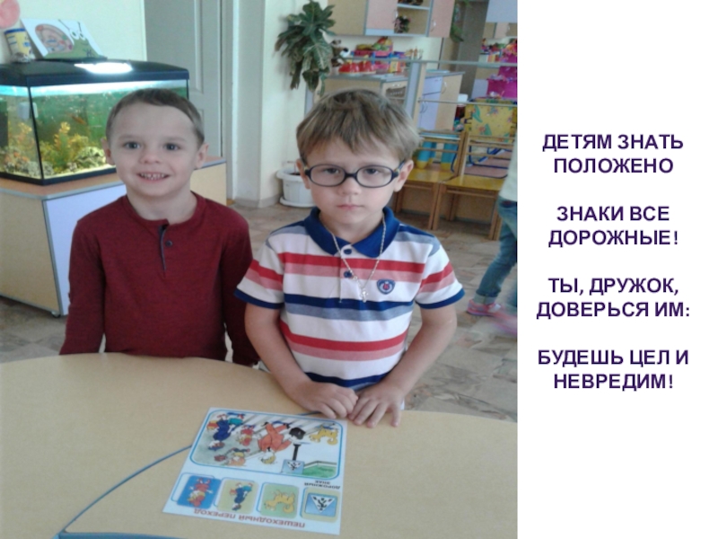 Детям знать положено Знаки все дорожные!Ты, дружок, доверься им:Будешь цел и невредим!