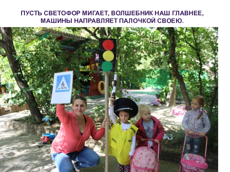 Слайд 25Пусть светофор мигает, волшебник наш главнее, машины направляет палочкой своею.