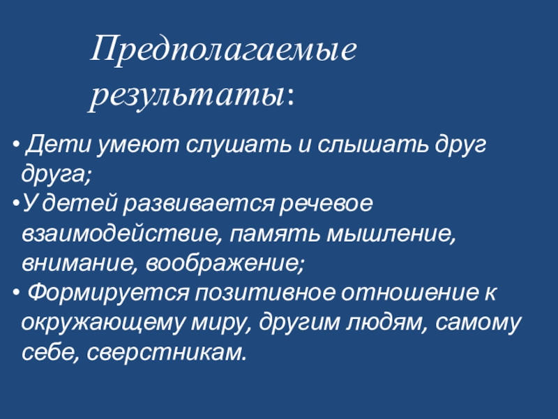 Предполагаемые результаты: Дети умеют слушать и слышать друг друга;У детей развивается речевое взаимодействие, память мышление, внимание, воображение;