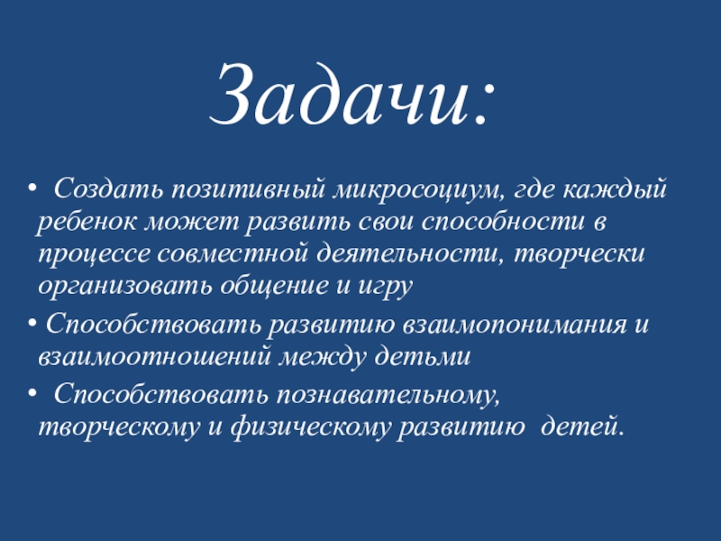Задачи: Создать позитивный микросоциум, где каждый ребенок может развить свои способности в процессе совместной деятельности, творчески организовать