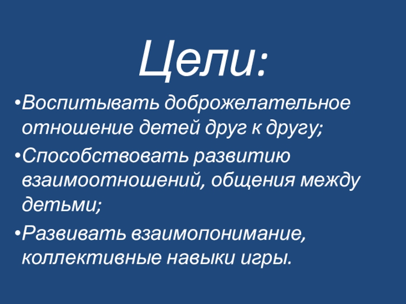 Цели:Воспитывать доброжелательное отношение детей друг к другу;Способствовать развитию взаимоотношений, общения между детьми;Развивать взаимопонимание, коллективные навыки игры.