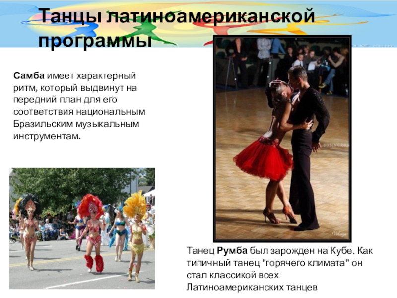 Танец Румба был зарожден на Кубе. Как типичный танец "горячего климата" он стал классикой всех Латиноамериканских танцев