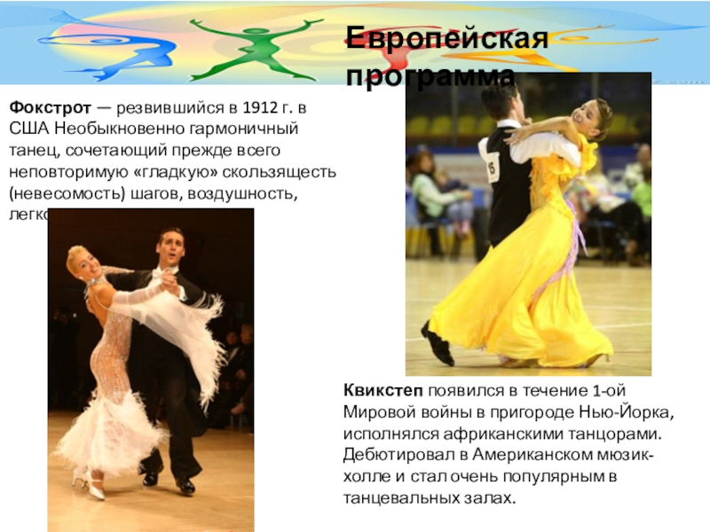 Квикстеп появился в течение 1-ой Мировой войны в пригороде Нью-Йорка, исполнялся африканскими танцорами.