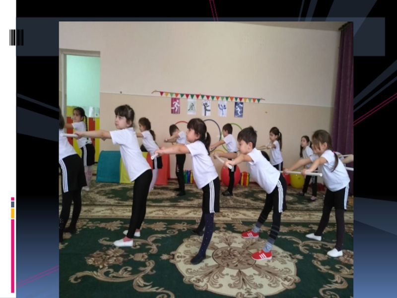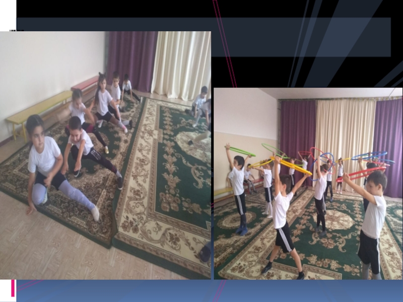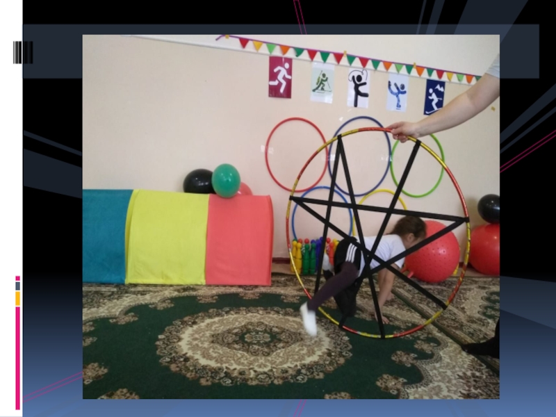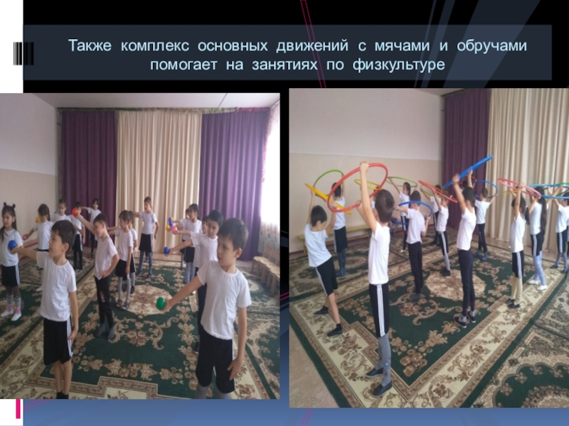 Слайд 17Также комплекс основных движений с мячами и обручами помогает на занятиях