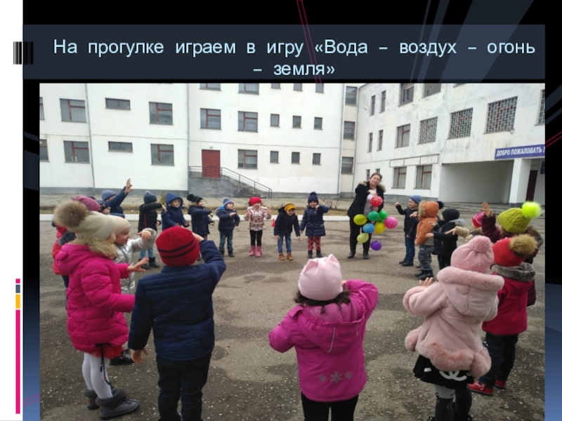 Слайд 26На прогулке играем в игру «Вода – воздух – огонь –