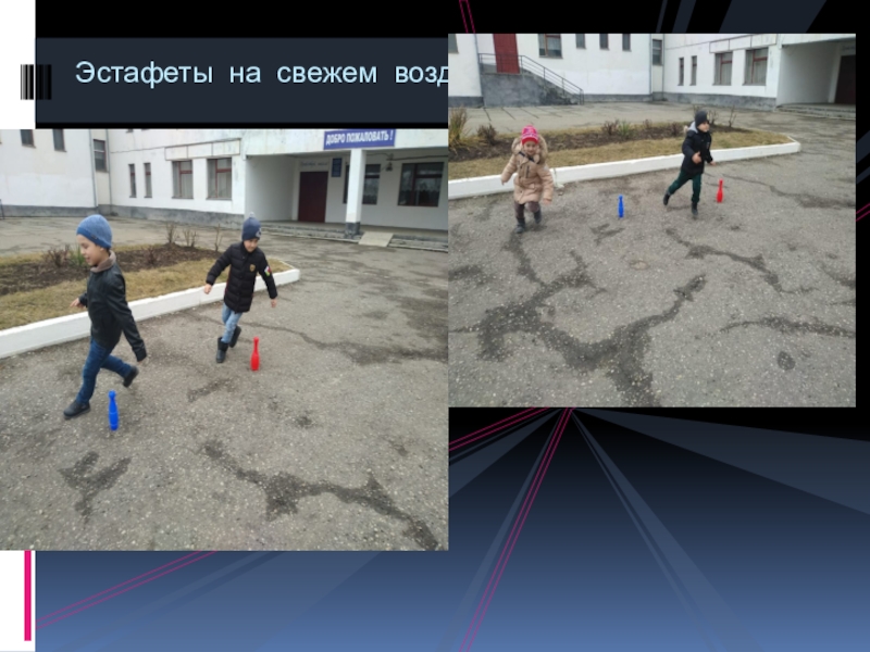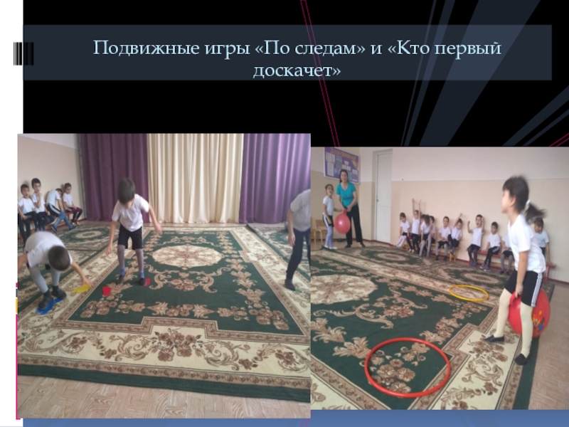 Слайд 11Подвижные игры «По следам» и «Кто первый доскачет»