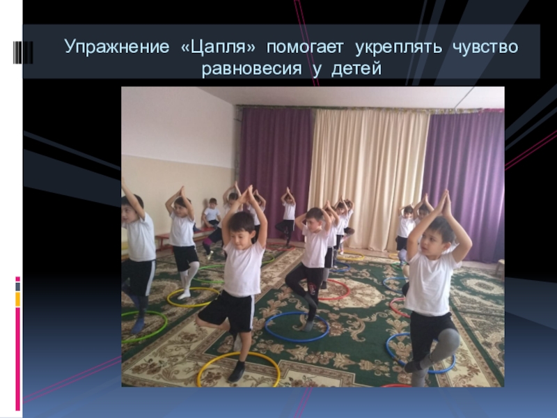 Слайд 16Упражнение «Цапля» помогает укреплять чувство равновесия у детей