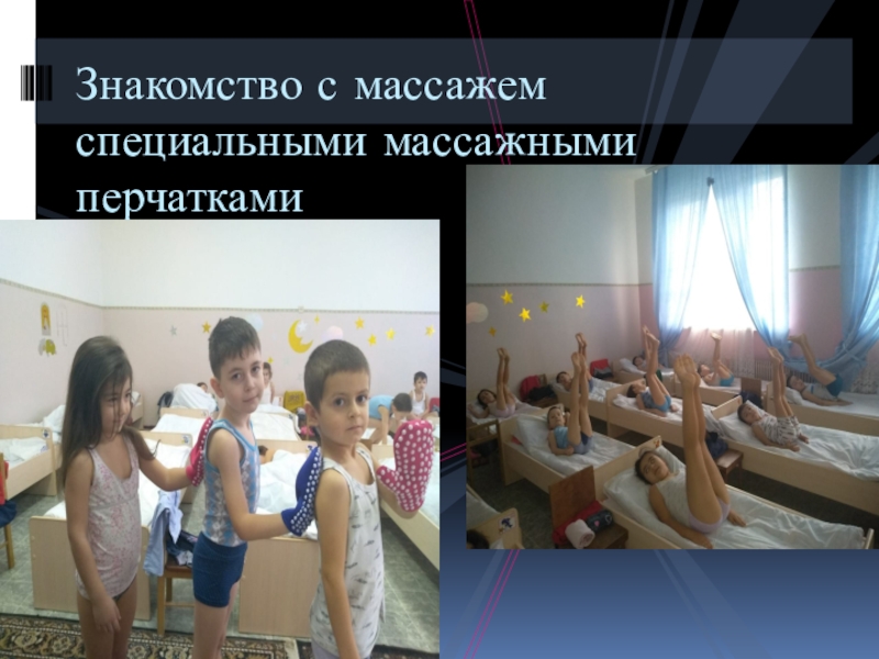 Слайд 32Знакомство с массажем специальными массажными перчатками