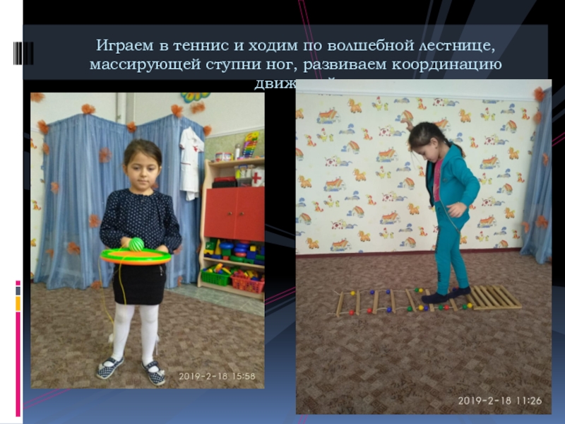 Слайд 5Играем в теннис и ходим по волшебной лестнице, массирующей ступни ног,