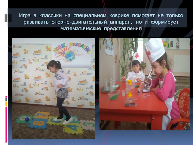 Слайд 30Игра в классики на специальном коврике помогает не только развивать опорно-двигательный