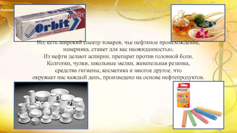 Слайд 15Но, есть широкий спектр товаров, чье нефтяное происхождение, наверняка, станет для