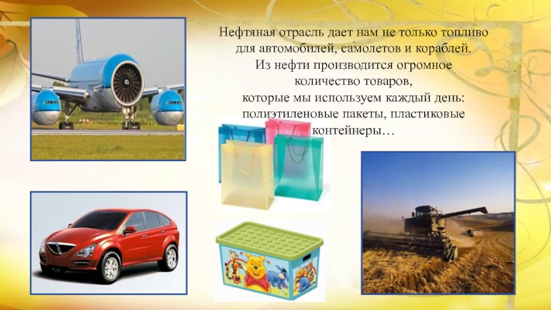 Слайд 12Нефтяная отрасль дает нам не только топливо для автомобилей, самолетов и
