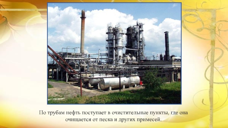 Слайд 9По трубам нефть поступает в очистительные пункты, где она очищается от