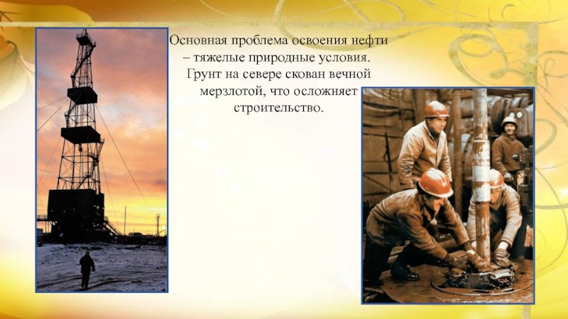 Слайд 4Основная проблема освоения нефти – тяжелые природные условия.