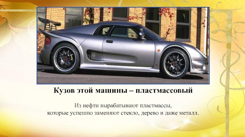 Слайд 13Кузов этой машины – пластмассовый