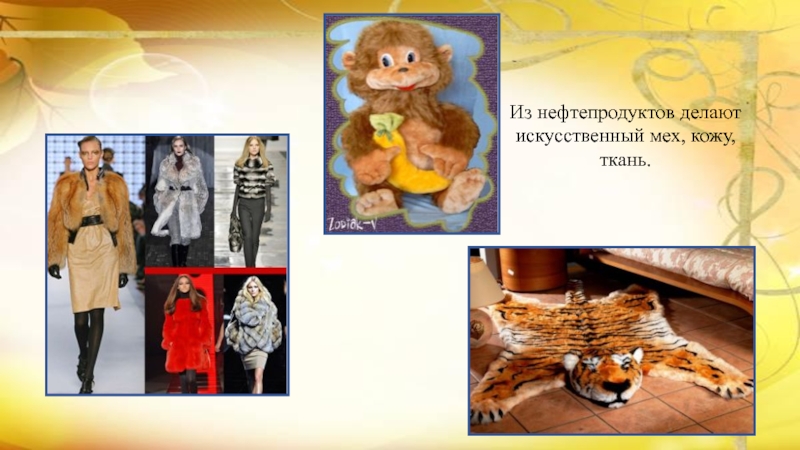 Слайд 14Из нефтепродуктов делают искусственный мех, кожу, ткань.