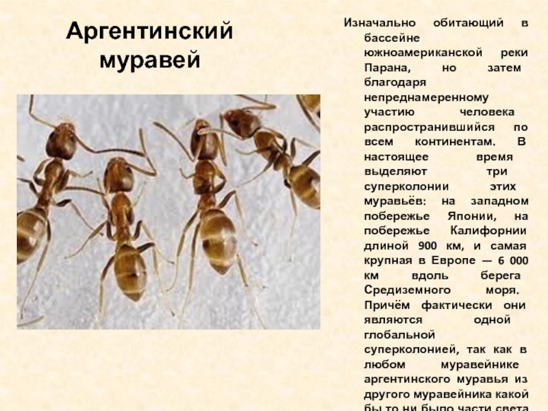 благодаря непреднамеренному участию человека распространившийся по всем континентам. В настоящее время выделяют три суперколонии этих муравьёв: на западном побережье Японии, на побережье Калифорнии длиной 900 км, и самая крупная в Европе — 6 000 км вдоль берега Средиземного моря. Причём фактически они являются одной глобальной суперколонией, так как в любом муравейнике аргентинского муравья из другого муравейника какой бы то ни было части света принимают за своего.