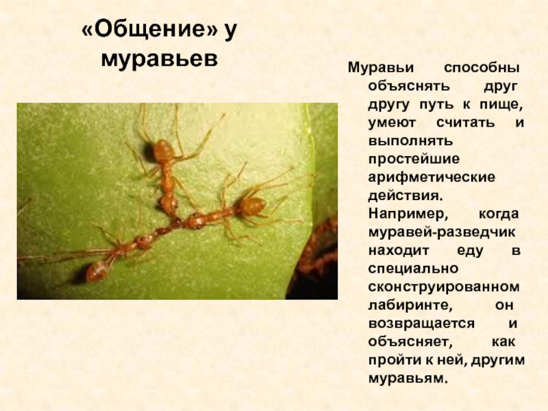 считать и выполнять простейшие арифметические действия. Например, когда муравей-разведчик находит еду в специально сконструированном лабиринте, он возвращается и объясняет, как пройти к ней, другим муравьям.