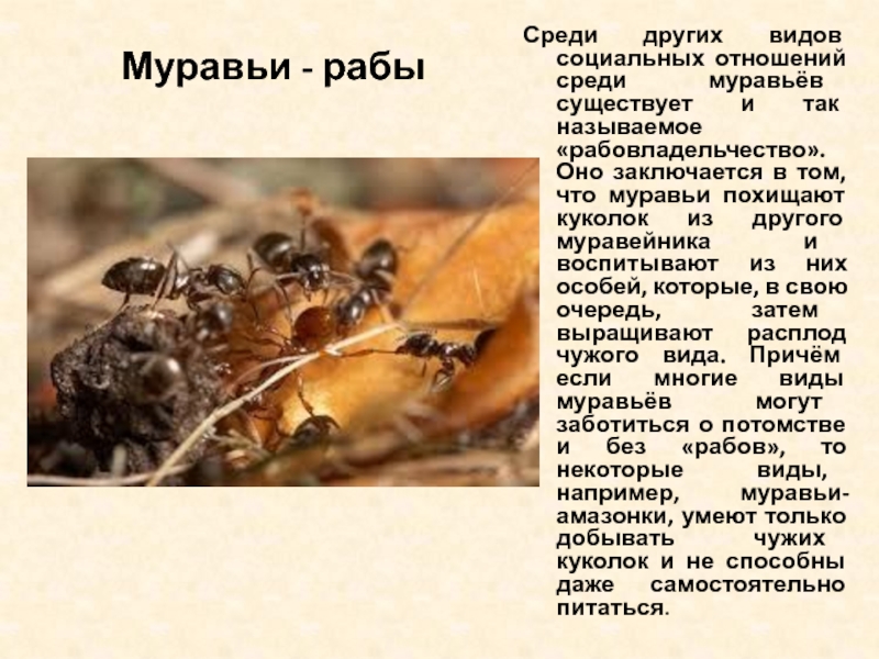так называемое «рабовладельчество». Оно заключается в том, что муравьи похищают куколок из другого муравейника и воспитывают из них особей, которые, в свою очередь, затем выращивают расплод чужого вида. Причём если многие виды муравьёв могут заботиться о потомстве и без «рабов», то некоторые виды, например, муравьи-амазонки, умеют только добывать чужих куколок и не способны даже самостоятельно питаться.