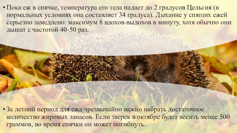 Слайд 6Пока еж в спячке, температура его тела падает до 2 градусов